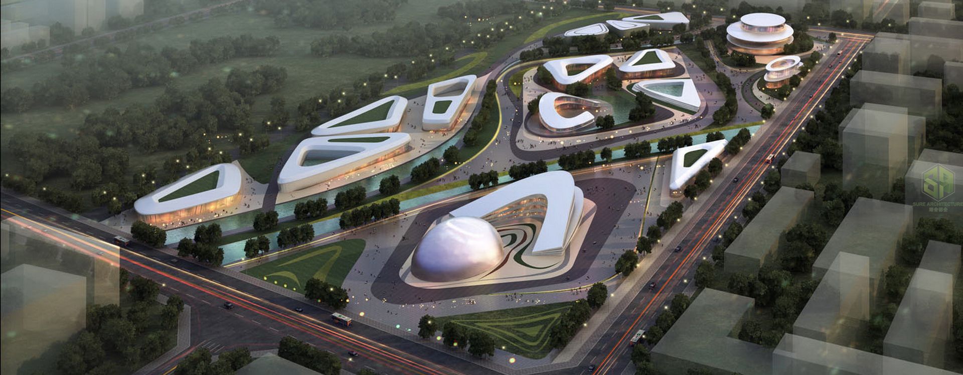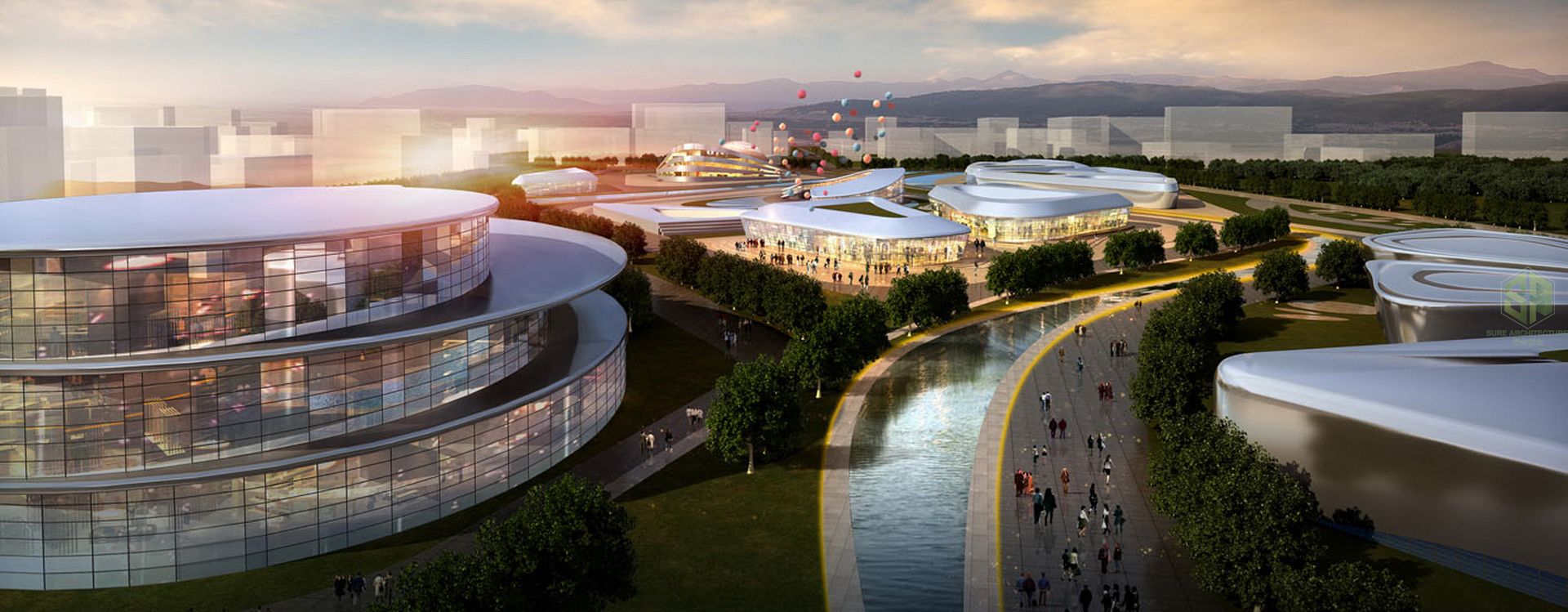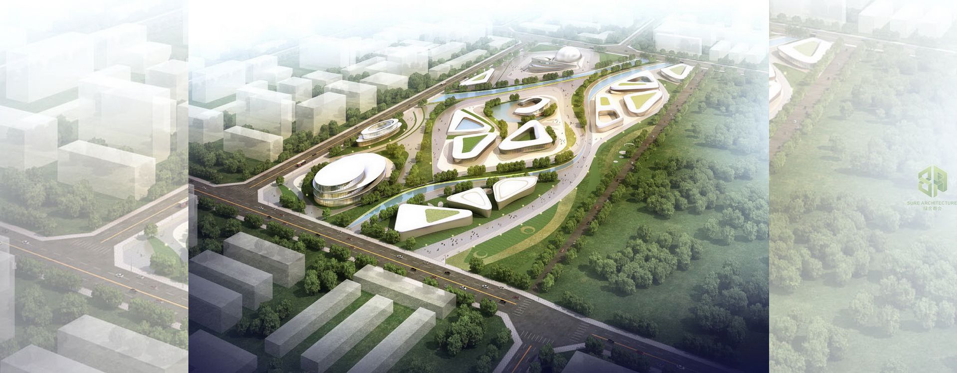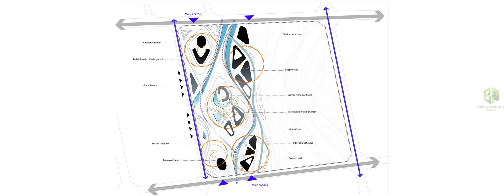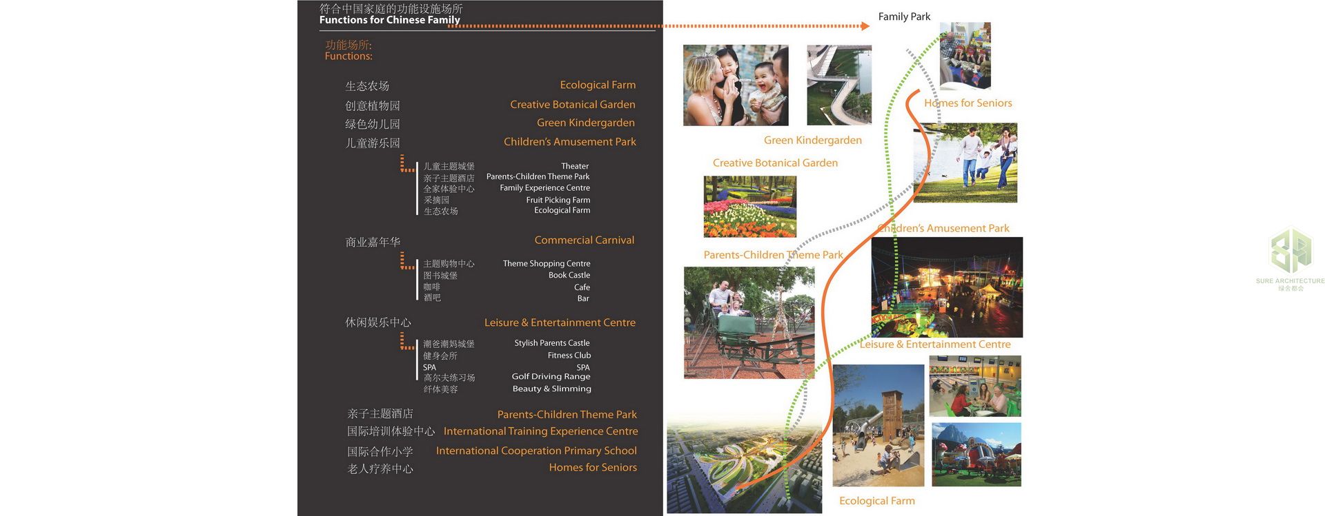The Children’s Family Park is a development program and a preliminary design for the enjoyment of Chinese families. Families in China are often separated because children are looked after by their grandparents outside of the big cities where their parents live and work. The objective of this project is to develop a concept park where families can meet up and enjoy their time together. This does not just include entire families but also extended relatives and friends who can join to create a society. The design is focused on this relationship between families. A comprehensive analysis of programs and site specific organizational principles has been used to realise connections with larger networks, integrating diverse parameters into a coherent design solution. The design aims to provide a sustainable approach in terms of ecology, economy and social cohesion by introducing a variety of public, cultural and technological spaces which are strongly linked to the natural landscape. The project encompasses and includes diverse uses such as: an ecological farm, creative botanical garden, green kindergarten, children’s amusement park, leisure & entertainment centre, parent-children theme park, international training experience centre, home for senior citizens and an international cooperation primary school all contained within this new thematic Family Park.