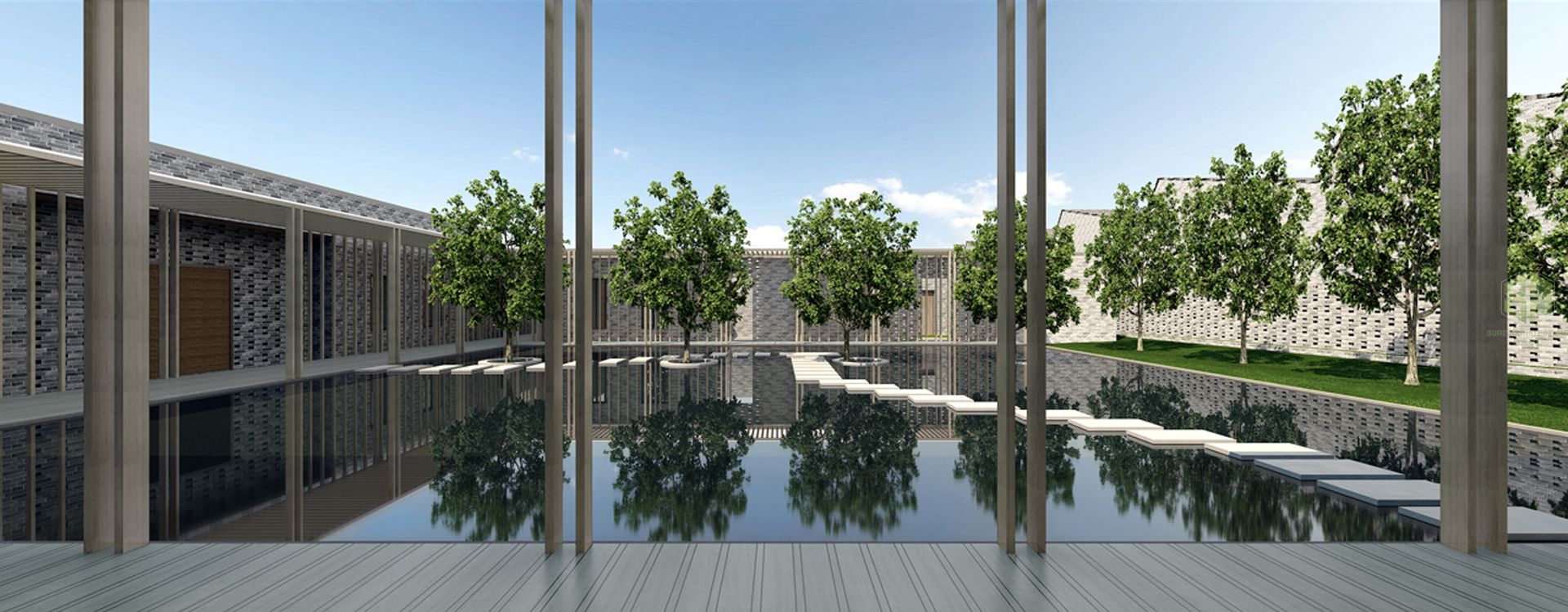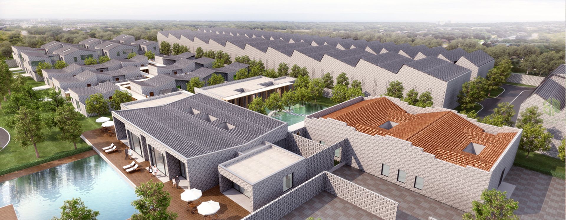 本项目位于北京市顺义区马坡镇庙卷村。规划建设总面积为19385.60平方米,其中地上建筑面积为18667.84平方米的厂房和附属设施,地下建筑面积为717.76平方米。本项目规划拟建新工厂用于高质量手工木制家具的生产、存贮和展示。结合中国的传统建筑特色,同时结合区域的自然生态环境,利用良好的水体与绿化,打造优美、舒适、生态的景观环境,使建筑与环境相得益彰,创造出高尚、丰富的视觉体验与空间感受。抓住地域特点,把握传统文化主体及现代审美取向,将我们的设计定位于传统建筑意象的现代诠释,传统审美的现代延续,希望能描绘最本源的中国传统式建筑文化及空间概念。